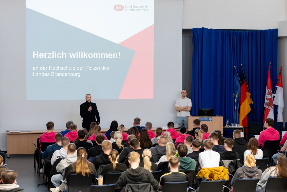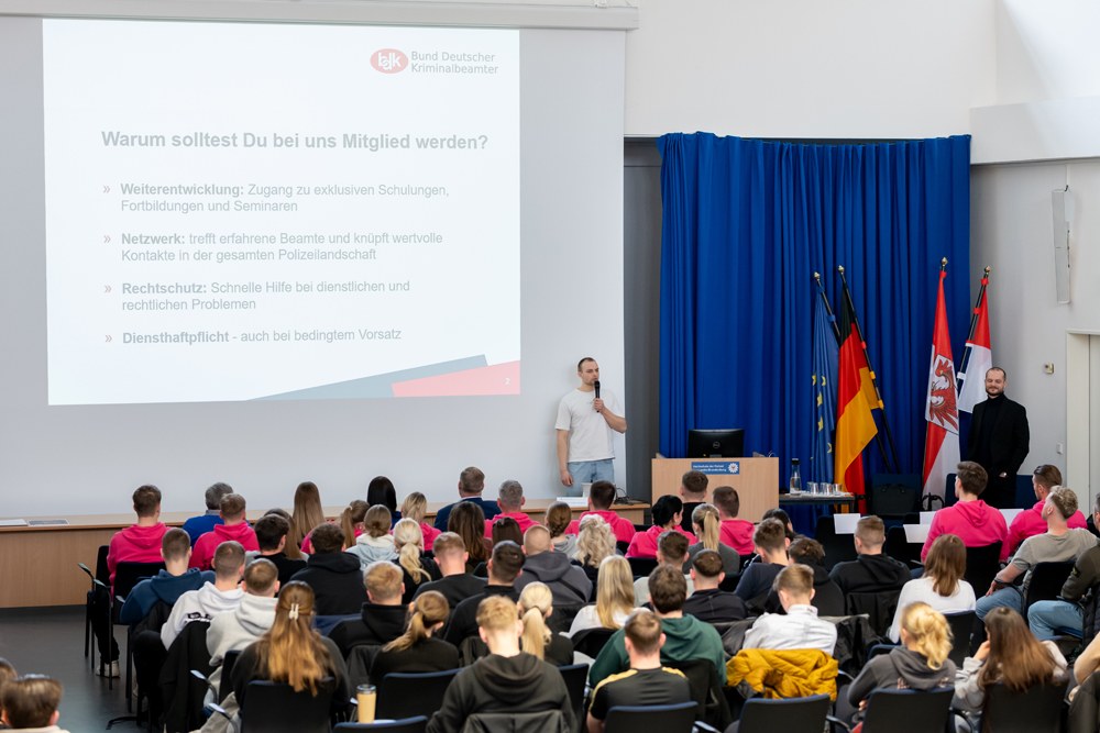Spontaner Applaus kam auf, als Christoph Wenzlaff mitten in seinem Vortrag zum Tag der Gewerkschaften an der Hochschule der Polizei des Landes Brandenburg zu den knapp 200 anwesenden neuen Auszubildenden und Studierenden sagt: