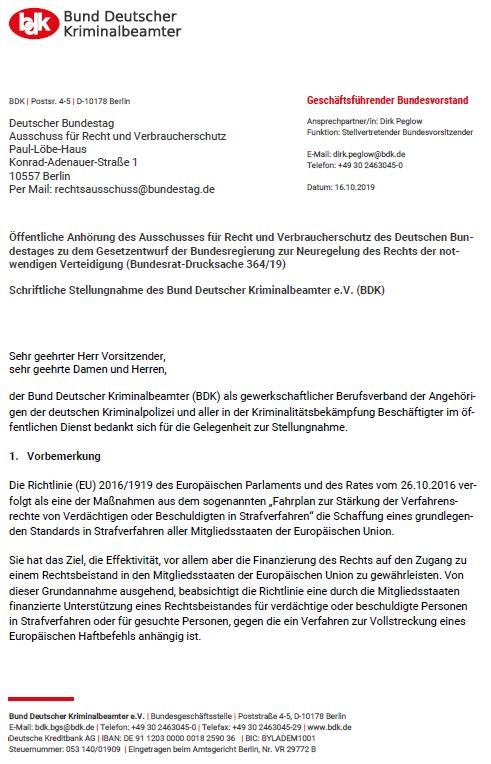 Schriftliche Stellungnahme des Bund Deutscher Kriminalbeamter e.V.Öffentliche Anhörung des Ausschusses für Recht und Verbraucherschutz des Deutschen Bundestages zu dem Gesetzentwurf der Bundesregierung zur Neuregelung des Rechts der notwendigen Verteidigung (Bundesrat-Drucksache 364/19)https://www.bdk.de/der-bdk/was-wir-tun/aktuelles/schriftliche-stellungnahme-des-bund-deutscher-kriminalbeamter-e.vhttps://www.bdk.de/der-bdk/was-wir-tun/aktuelles/schriftliche-stellungnahme-des-bund-deutscher-kriminalbeamter-e.v/@@images/image-1200-70a4ebc78708edc04167fbf0513b7dfe.jpeg