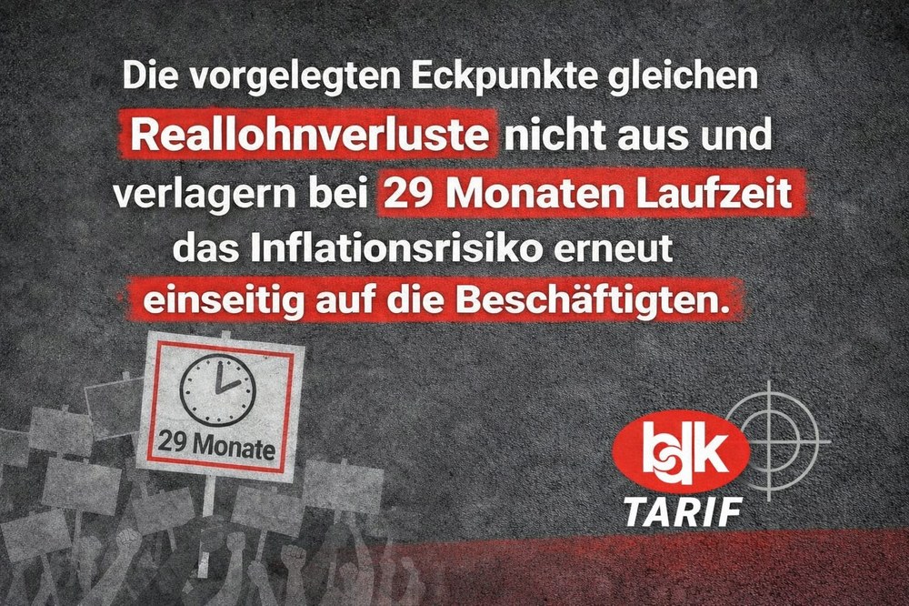 Die angebotene Entgeltentwicklung „leicht oberhalb der Inflation“ bei einer Laufzeit von 29 Monaten bedeutet eine massive zeitliche Streckung notwendiger Anpassungen. Das wirtschaftliche Risiko wird weiterhin einseitig auf die Beschäftigten verlagert. Gleichzeitig wird die tarifpolitische Reaktionsfähigkeit für einen sehr langen Zeitraum erheblich eingeschränkt – ein gefährliches Signal in unsicheren Zeiten.