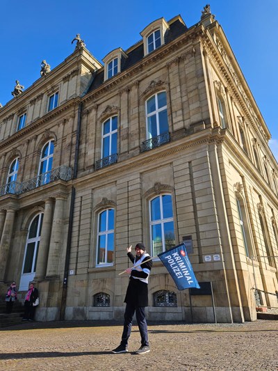Steffen Mayer - vor dem Finanzministerium BW - mit klarem Fingerzeig, wer jetzt handeln muss! (Bildquelle: BDK-BW)